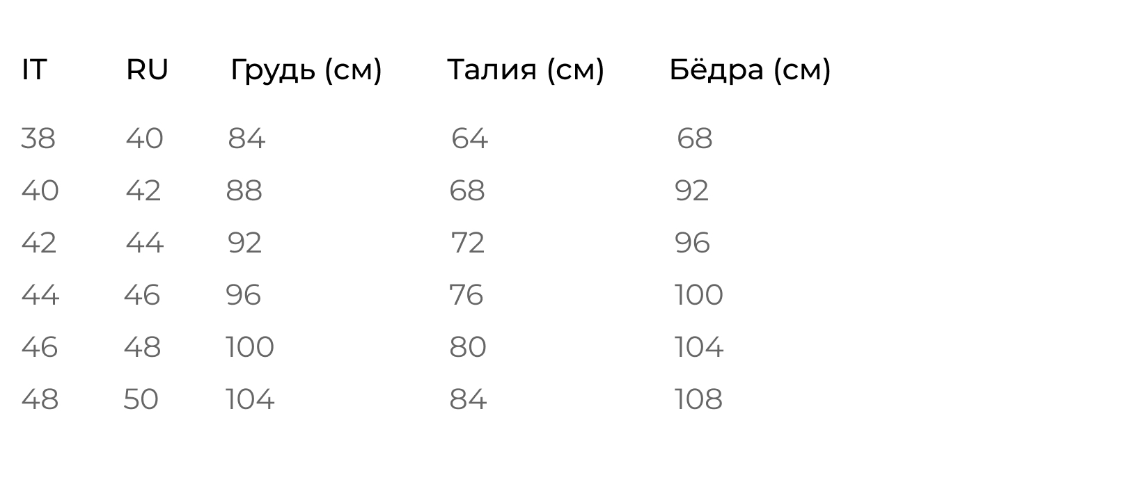 Изделие доступно на сайте и в студии в размере 40 (It). Если вам необходим другой размер, оформите заказ — наш менеджер свяжется с вами, уточнит детали и передаст заказ в производство.